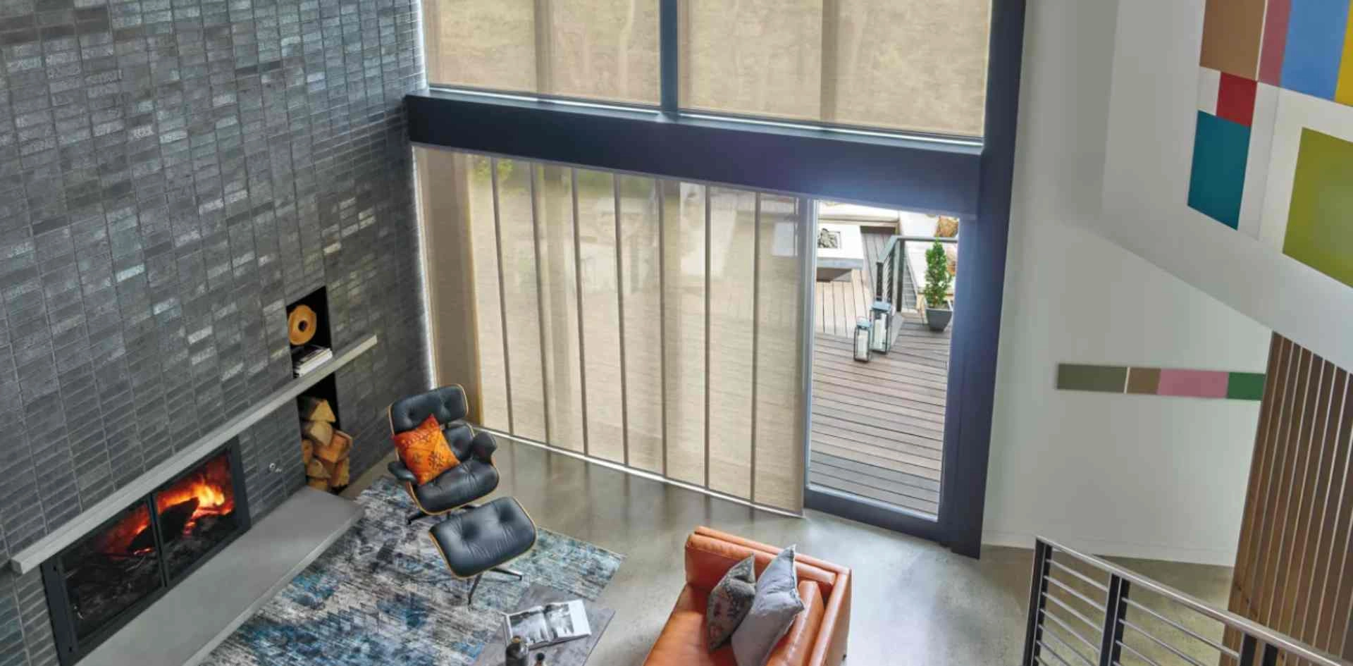 - Versatility: Hunter Douglas Skyline® Panel-Track Blinds are perfect for large glass areas like sliding doors or windows. They can also double as a room divider in open-concept spaces, creating a functional area with privacy.